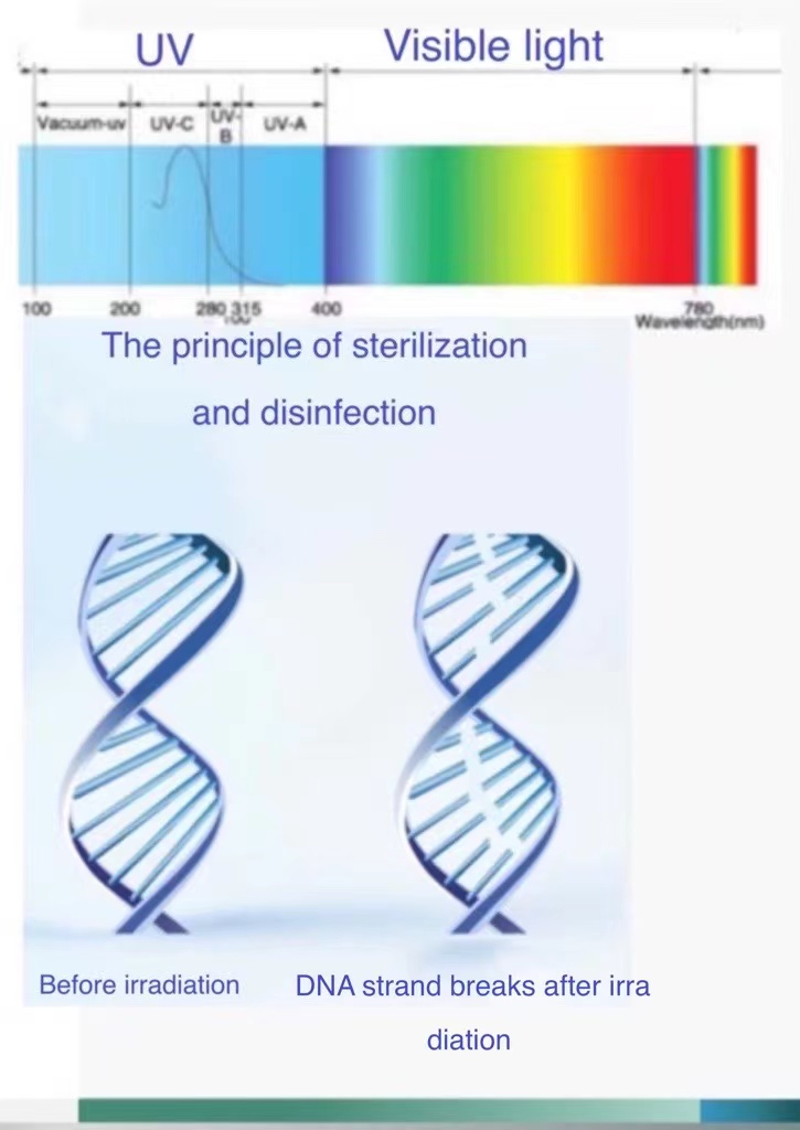 Second Energy: High-intensity UVB and UVA ultraviolet light, with 100,000 times the power of sunlight, causing protein cross-linking denaturation and inhibition of biological enzyme activity in microorganisms.